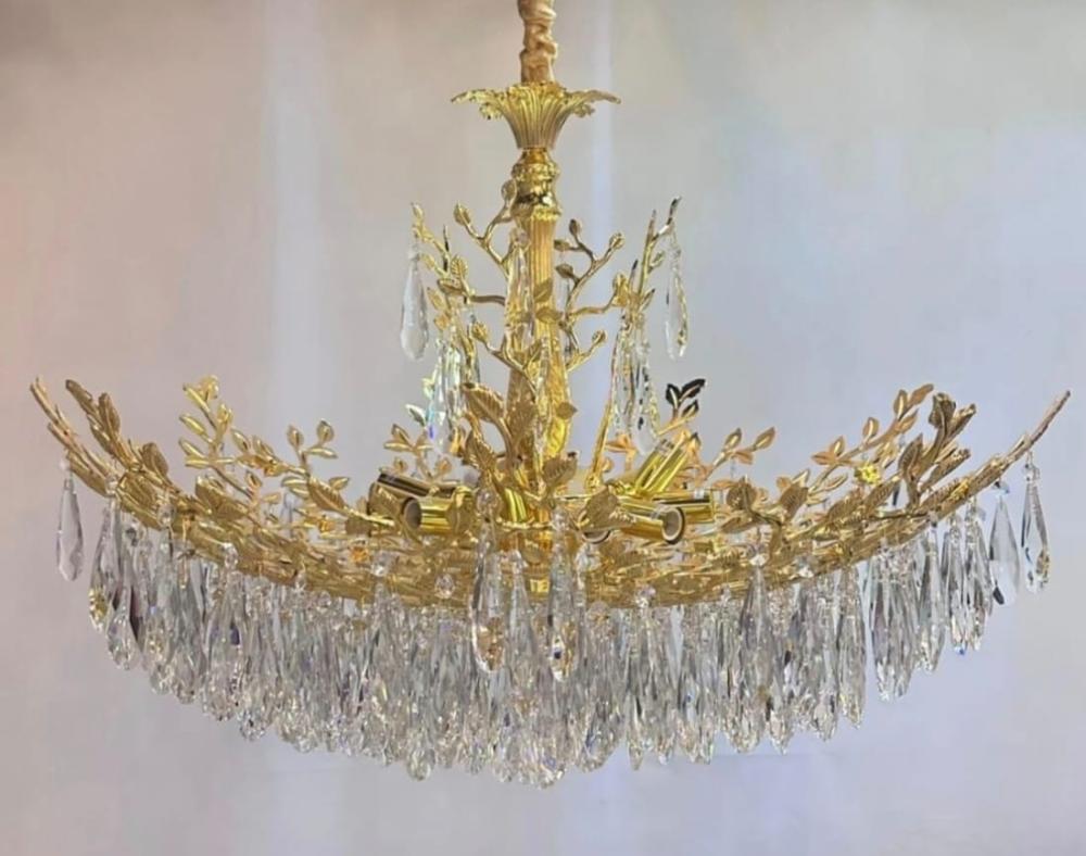 أضف لمسة من الفخامة والرقي لمنزلك مع هذه الثريا الكريستالية المذهلة، بتصميم أوراق ذهبية متشابكة وكريستالات متدلية تعكس الإضاءة بأناقة. مثالية لغرف المعيشة، صالات الاستقبال، وغرف الطعام.