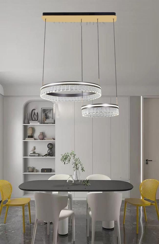 ثريا فاخرة تتكون من حلقتين LED بتصميم دائري مزين بالكريستال، تضيف أناقة مبهرة لأي مساحة داخلية. مثالية للطاولات، المجالس أو الزوايا المفتوحة بتصميم عصري وهادئ.