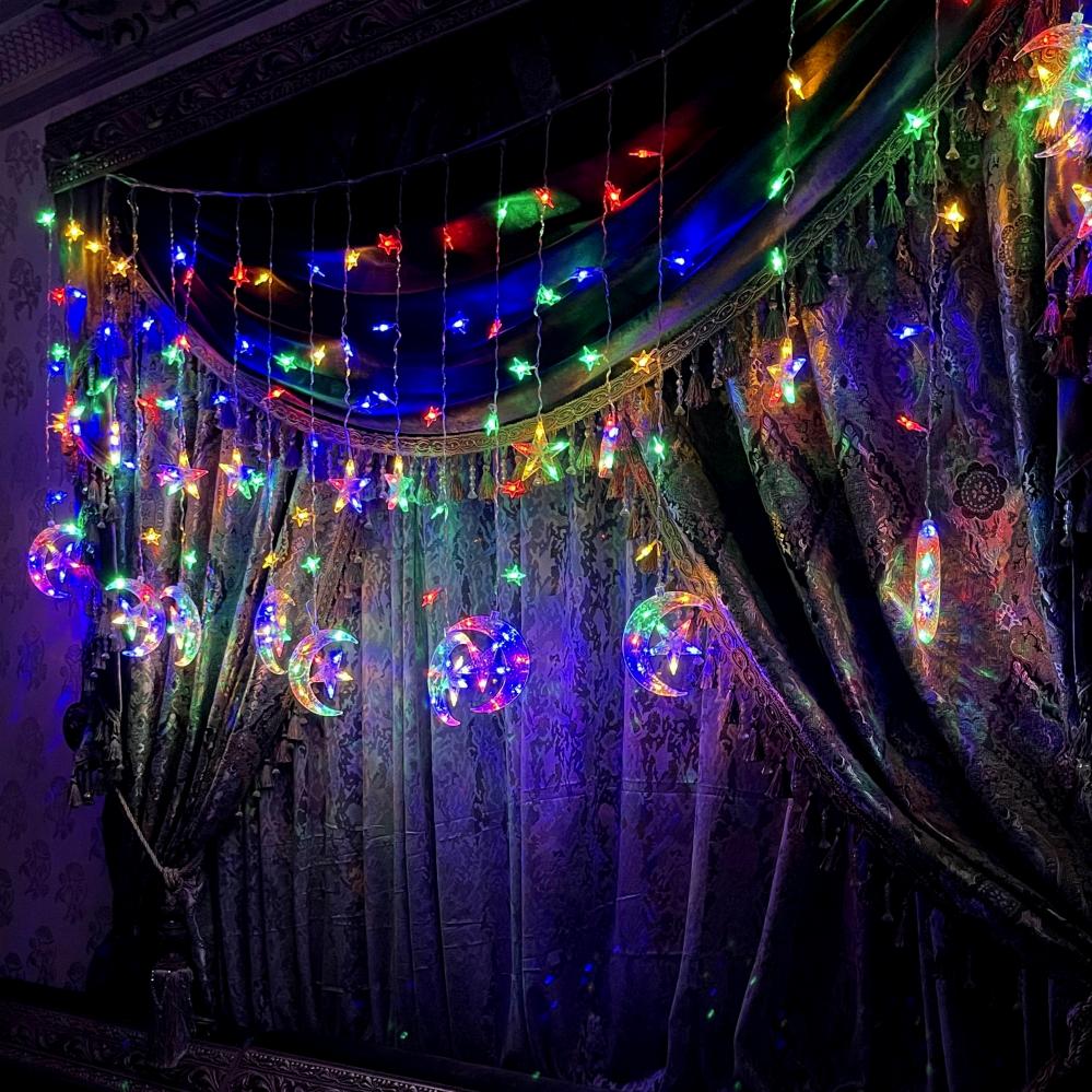 مصباح زينة على شكل هلال ونجمة مناسب لتزين المنزل بشهر رمضان الكريم بطول 3 متر بألوان الطيف السبعة يأتي مع ريموت تحكم عن بعد