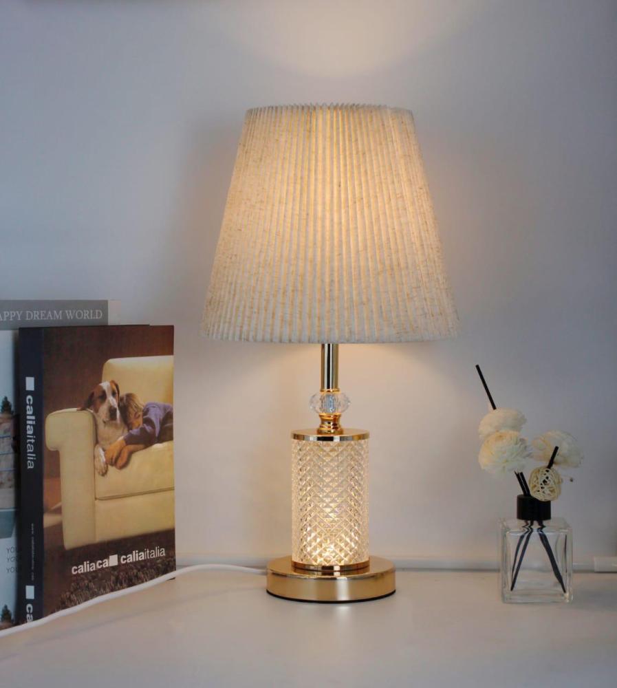 هذا المصباح الأنيق يقدم تصميمًا يجمع بين الفخامة والوظيفة العملية. يتميز بقاعدة أسطوانية شفافة مزخرفة بتفاصيل ماسية بارزة، تضفي لمسة فاخرة على التصميم وتعمل أيضًا على توزيع الضوء بشكل جميل. القاعدة الذهبية اللامعة تضيف لمسة راقية وتكمل التصميم العصري للمصباح.